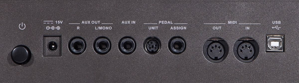 - Разъёмы: DC IN, Headphones, AUX IN, AUX OUT, Assign Pedal,