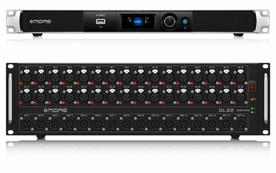 Комплект из процессорного блока Midas M32C и блока входов/выходов DL32. По функциям полностью идентичен модели M32, за исключением органов управления. Управление возможно с компьютера по сети или через Wi-Fi роутер. Поставляется двумя отдельными позициями. Midas M32C и Midas DL32