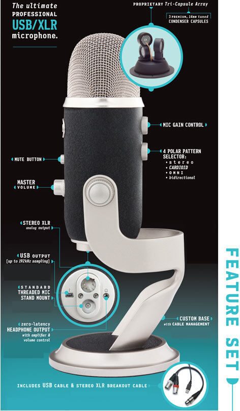 В микрофоне Blue Yeti установлен мощный аналого-цифровой преобразователь высокого класса, конвертирующий сигнал для обработки на компьютере. Наличие усилителя для стереонаушников позволяет контролировать работу в реальном времени. Возможности микрофона увеличивают, размещенные на корпусе регуляторы усиления, громкости, «мютирования» звука и переключатель диаграмм направленности.
