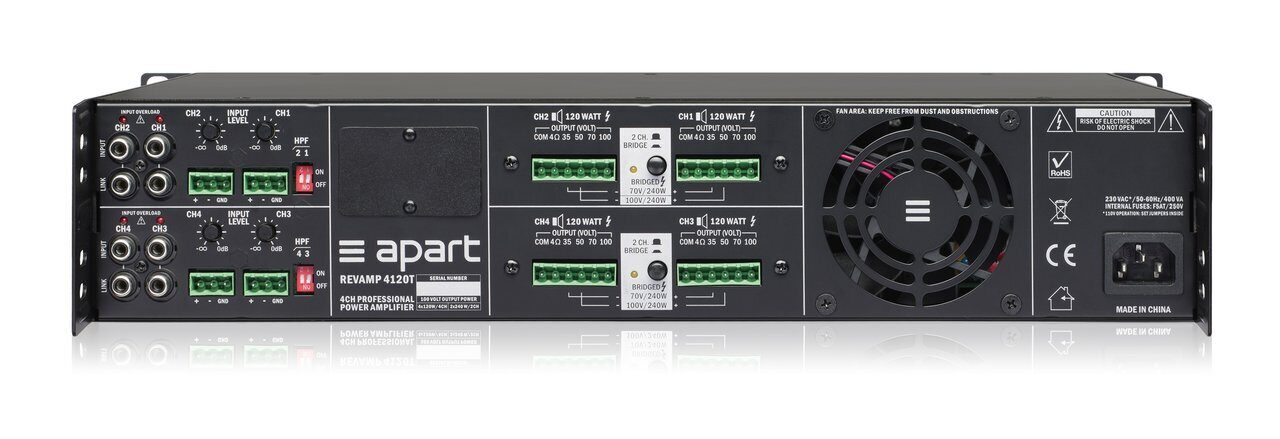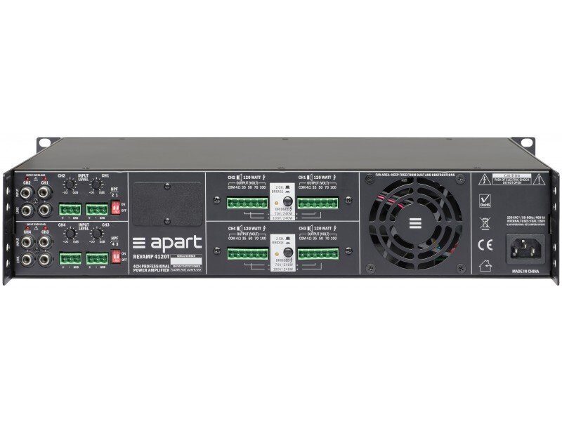 APart REVAMP4120T может использоваться для усиления четырех моно зон, двух стерео зон, двух моно зон в мостовом режиме или одной стерео зоны в стерео режиме. Усилитель имеет интеллектуальный вентилятор охлаждения с переменной скоростью вращения, который активируется только в чрезвычайной ситуации. Для каждого из аудио входов предусмотрена настройка чувствительности. Для подключения рупорных громкоговорителей, каждый канал оборудован фильтром верхних частот с частотой среза 250 Гц.