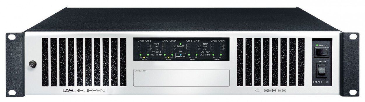 Lab Gruppen C20:8X– 8-канальный усилитель мощности класса TD, предназначенный для звуковых инсталляционных систем высочайшего качества и надёжности. Важной особенностью усилителя является фирменный сетевой интерфейс NomadLink, позволяющий через устройство сопряжения NLB-60E объединять до 60 усилителей в сеть, используя стандартный TCP/IP-протокол и программное обеспечение DeviceControl.