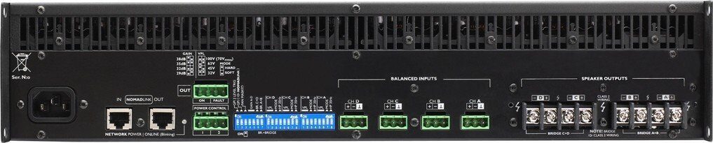 В C Series предусмотрены импульсные блоки питания, система охлаждения Intercooler, индивидуальная настройка пикового напряжения на выходах, переключение в мостовой режим и детальная регулировка чувствительности. Усилители работают как с обычной нагрузкой, так и с линиями 70/100 В. На каждом канале предусмотрена защита по напряжению, по току, от перегрева и от КЗ.