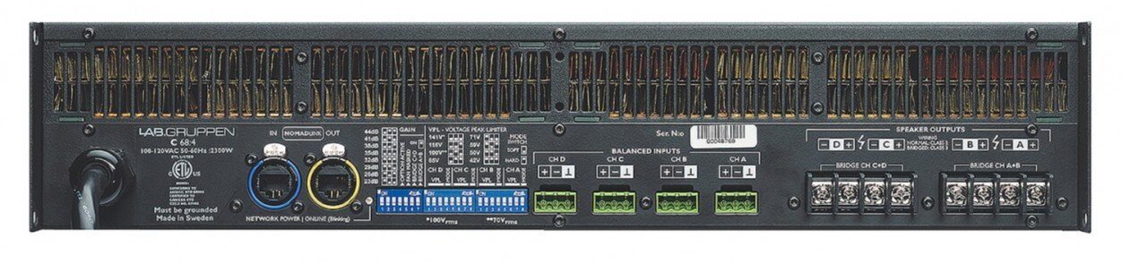 Инсталляционный 4-х канальный усилитель Lab.gruppen C68:4 высшего класса с дистанционным мониторингом состояния и включением/выключением (через внешний блок NLB 60). Работа на низкоомную нагрузку и трансляционную линию 70/100В. Универсальный импульсный блок питания, некритичный к входному напряжению (130 - 265В). Возможность работы на нагрузку с импедансом 2Ом (1200Вт на канал). Попарное включение каналов в мостовой режим с удвоением мощности (или напряжения при работе на трансляционную линию). Малые габариты и вес (2U, 12кг). Переключаемый коэффициент усиления напряжения (по умолчанию 35дБ). Отключаемый поканально обрезной фильтр 35Гц.