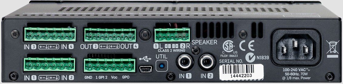 Высококачественный двухканальный компактный усилитель для локального размещения. Может устанавливаться на поверхность (в комплекте 2 уголка), на трубу (опциональный комплект) и в стойку 19" (опциональный адаптер). Встроенный DSP: 4-х полосный EQ на каждом входе, лимитер, задержки, автоматическая тонкомпенсация. Управление через USB (апгрейд, настройки), GPIO (включение/выключение, громкость, выбор источника), RS232. Некритичность к напряжению питания (85-265В). Мощность 2х120Вт2/4/8Ом. 216x44х280мм, 1,9кг.
