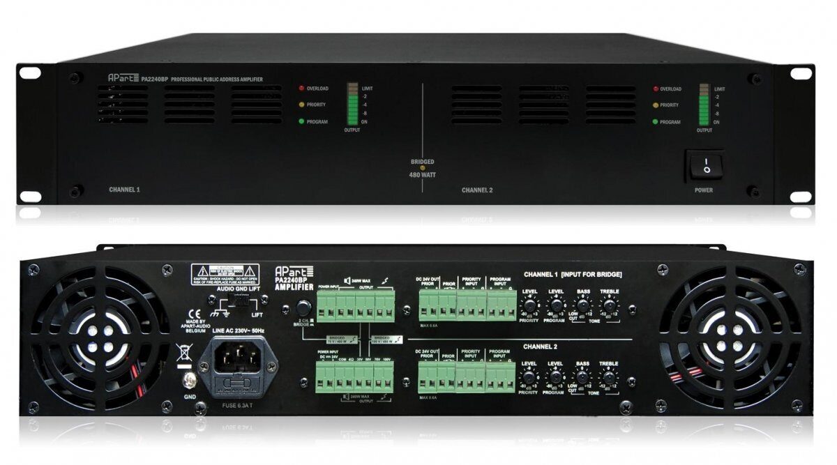 Apart PA2240BP профессиональный двухканальный усилитель мощности. Усилитель имеет выход для подключения низкоомной нагрузки с минимальным импедансом 4 Ома, для подключения трансляционной линии 35В, 50В, 70В, и 100В. В мостовом режиме минимальный импеданс нагрузки на низкоомном выходе составляет 8 Ом. также мостовой режим используется для линий 70В и 100В. Усилитель имеет возможность включения мостового режима. Имеется приоритетный линейный вход для включения сигнала тревоги в чрезвычайной ситуации. Приоритетный вход включается замыканием контактов на задней панели.