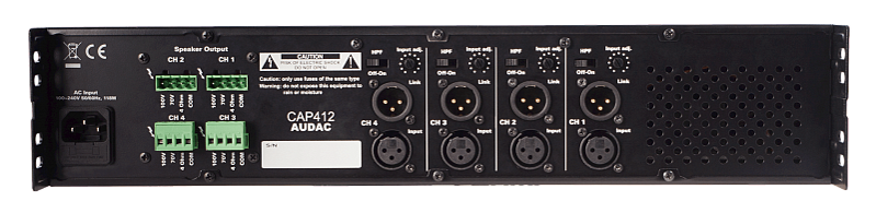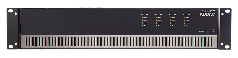 CAP412 – 4-канальный усилитель мощности 4х120 Вт. Предназначен для распределенных аудиосистем. Обеспечивает выходную мощность 120 Вт в каждом канале, имеющем высокоомные выходы 100/70 В и низкоомный выход 4 Ом. Усилитель обеспечен НЧ-фильтрами, регуляторами усиления, защитой от перегрузок и разъемами для транзита входных сигналов.