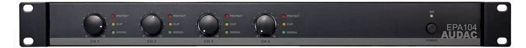 EPA104 – четырехканальный усилитель мощности класса D. Выходная мощность 4х100 Вт/4 Ом, 4х50 Вт/8 Ом, 2х200 Вт/8 Ом. Переход в режим ожидания при отсутствии сигнала. Защита от короткого замыкания, перегрева, перегрузки, ограничение выходного сигнала. Режимы работы: мостовой/ стерео/ параллельный, возможно включение кроссовера 120 Гц. Входы: 4х XLR (розетка). Стальной корпус высотой 1U в рэковом исполнении.