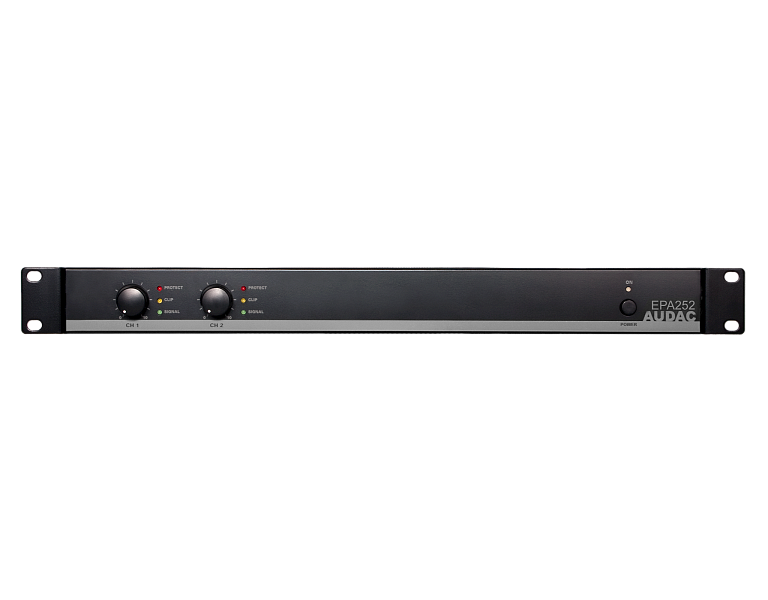 EPA252 – двухканальный усилитель мощности класса D. Выходная мощность 2х250 Вт/4 Ом, 2х130 Вт/8 Ом, 1х500 Вт/8 Ом. Переход в режим ожидания при отсутствии сигнала. Защита от короткого замыкания, перегрева, перегрузки, ограничение выходного сигнала. Режимы работы: мостовой/ стерео/ параллельный. Входы: 2х XLR (розетка) с проходными выходами на разъемах XLR (вилка). Стальной корпус высотой 1U в рэковом исполнении.