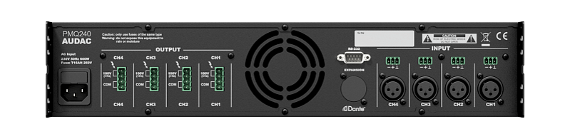 PMQ240 – 4-канальный усилитель мощности, оснащенный DSP-процессором и усилительными модулями класса D. Выходная мощность 240 Вт RMS на канал (100 В/8 Ом). Цифровые фильтры, параметрический 7-полосный эквалайзер, временная задержка сигнала, фиксированная выходная мощность, схемы защиты выхода. Каждый канал усилителя индивидуально настраивается на нугрузку 8 Ом или 100 В. Загрузка настроек DSP через USB, управление через RS-232. Опционально поставляется 4-канальная карта Dante. Усилитель имеет стальной корпус высотой 2U в рэковом исполнении.