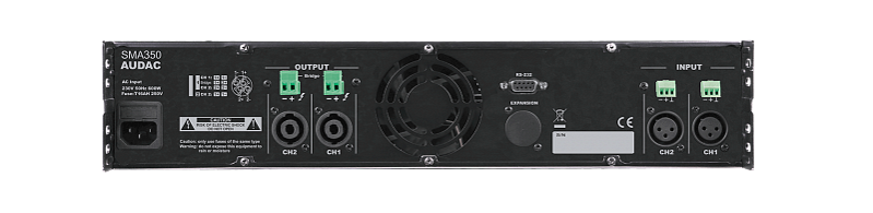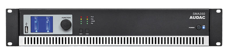 SMA350 – двухканальный усилитель мощности, оснащенный DSP-процессором и усилительными модулями класса D. Выходная мощность 2х350 Вт RMS (4 Ом). Цифровые фильтры, параметрический эквалайзер, временная задержка сигнала, фиксированная выходная мощность, схемы защиты выхода. Загрузка настроек DSP через USB, управление через RS-232. Стальной корпус высотой 2U в рэковом исполнении.