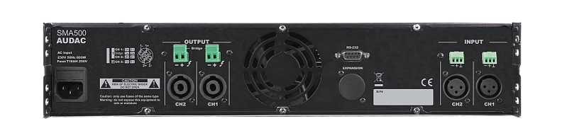 SMA500 – двухканальный усилитель мощности, оснащенный DSP-процессором и усилительными модулями класса D. Выходная мощность 2х500 Вт RMS (4 Ом). Цифровые фильтры, параметрический эквалайзер, временная задержка сигнала, фиксированная выходная мощность, схемы защиты выхода. Загрузка настроек DSP через USB, управление через RS-232. Стальной корпус высотой 2U в рэковом исполнении.