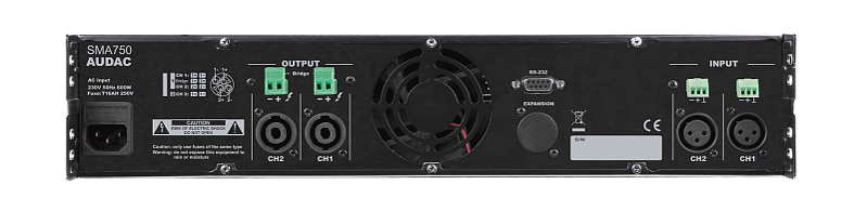 SMA750 – двухканальный усилитель мощности, оснащенный DSP-процессором и усилительными модулями класса D. Выходная мощность 2х750 Вт RMS (4 Ом). Цифровые фильтры, параметрический эквалайзер, временная задержка сигнала, фиксированная выходная мощность, схемы защиты выхода. Загрузка настроек DSP через USB, управление через RS-232. Стальной корпус высотой 2U в рэковом исполнении.