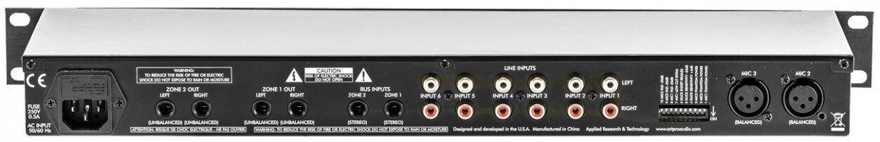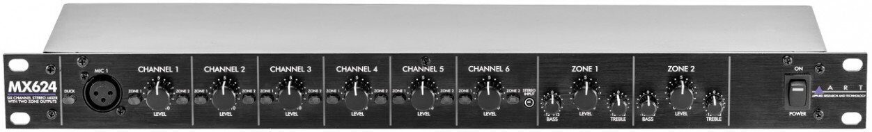 ART MX624 шестиканальный стерео микшер с двумя зональными выходами, который может быть использован в системах public address, а также на сцене и в студии. Рэковый 19” формат 1U и встроенный источник питания позволяют вписать микшер в ограниченное пространство.