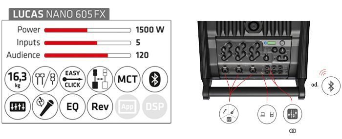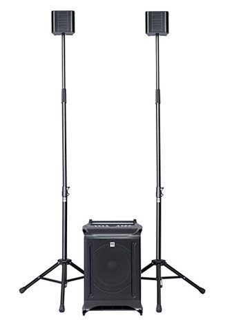Мобильный звукоусилительный комплект, мощность 460 Вт, вес 16.3 кг, 130 дБ, активный 10` сабвуфер и два сателлита 4,5`+1`, 43 - 20000 Гц, 5-ти канальный микшер с эффектами, функция объединения двух комплектов в стереосистему.