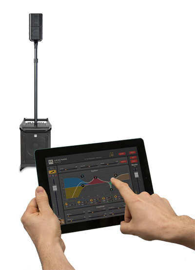 Lucas Nano 608i располагает встроенным микшером (8 каналов) с прямым управлением с сабвуфера либо дистанционным через iPad по соединению Bluetooth. В последнем способе пользователь при помощи приложения iOS может регулировать компрессор, параметрический эквалайзер на 4 полосы и пресеты реверберации. Менять настройки и сохранять в виде пресетов можно как на интуитивном режиме Expert Mode, так и на продвинутом Expert Mode.
