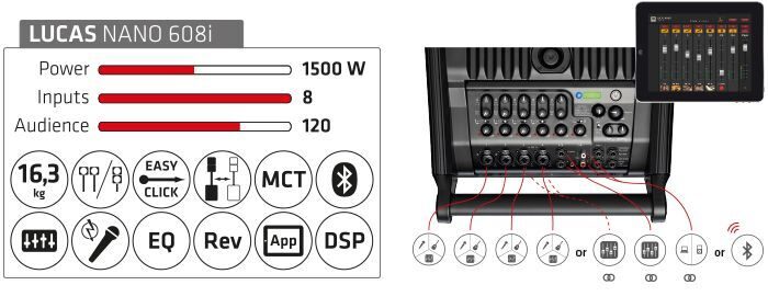 Портативная система звукоусиления модели Lucas Nano 608i включает активный сабвуфер и пару небольших по размерам сателлитов. Мощность такая же, как у версии Lucas Nano 600, но предусмотрено большее количество входов и расширен функционал. Система предназначена для эстрадных артистов, сольных музыкантов, небольших групп и диджеев.