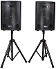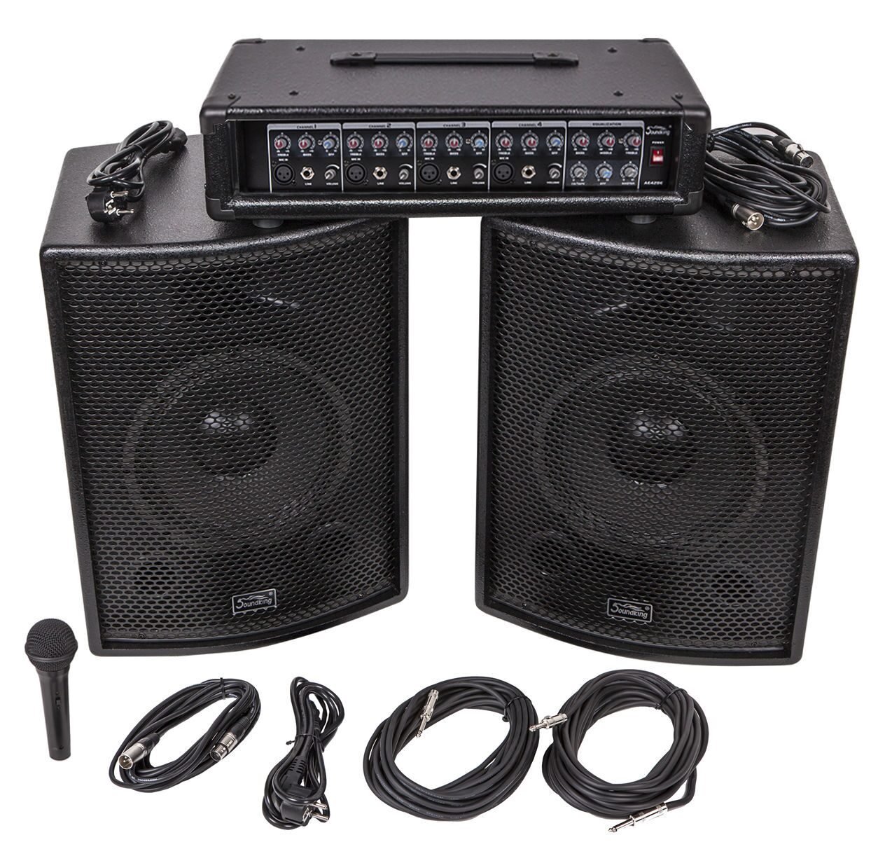 Мобильный звуковой комплект общей мощностью 200 Вт состоящий из микшерного пульта со встроенным усилителем, акустических систем с 10" динамиками и пьезо твитером. В комплект поставки так же входят две акустические стойки под АС, динамический микрофон с кабелем 5 метров и два акустических кабеля Jack-Jack длиной по 10 метров каждый.