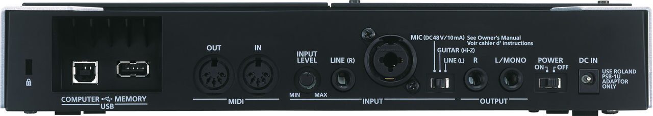 Коммутация: выходные разъемы (L/MONO, R), разъем для наушников Headphone, входные разъемы Input (MIC/GUITAR/LINE(L), LINE(R)) (MIC: типа джек 1/4 дюйма или типа XLR с возможностью фантомного питания; GUITAR: джек 1/4 дюйма (с высоким входным импедансом Hi-Z); Line (L), LINE (R) – джеки 1/4 дюйма. Разъемы MIDI (IN, OUT). Разъемы USB: COMPUTER (поддерживает как передачу по USB сообщений MIDI, так и аудио; требуется высокоскоростной порт USB); MEMORY (поддерживает карты памяти USB 2.0)
